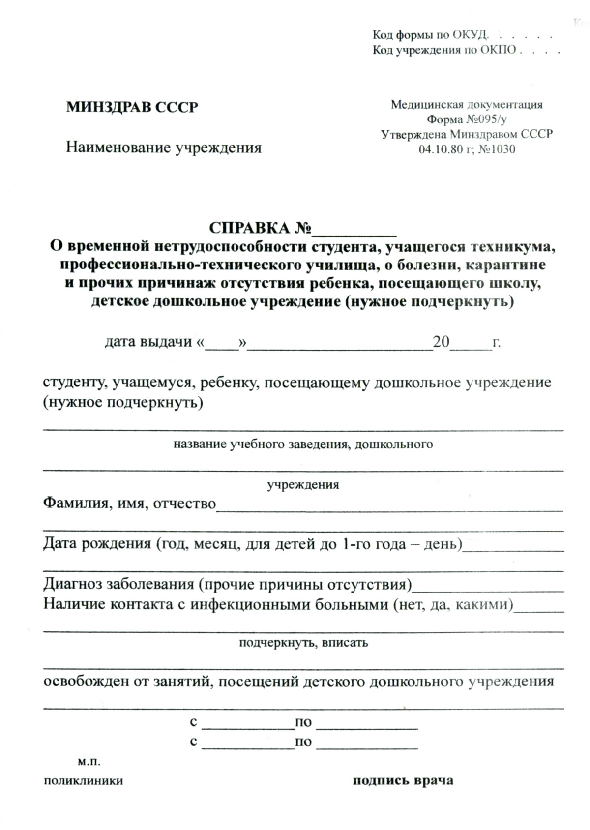 Медицинская справка о временной нетрудоспособности (форма 095/у) выдаётся учащимся школы, ВУЗа и любого другого учебного заведения. Освобождает от посещения занятий на всё время болезни, может быть выписана на срок не более 14 дней.